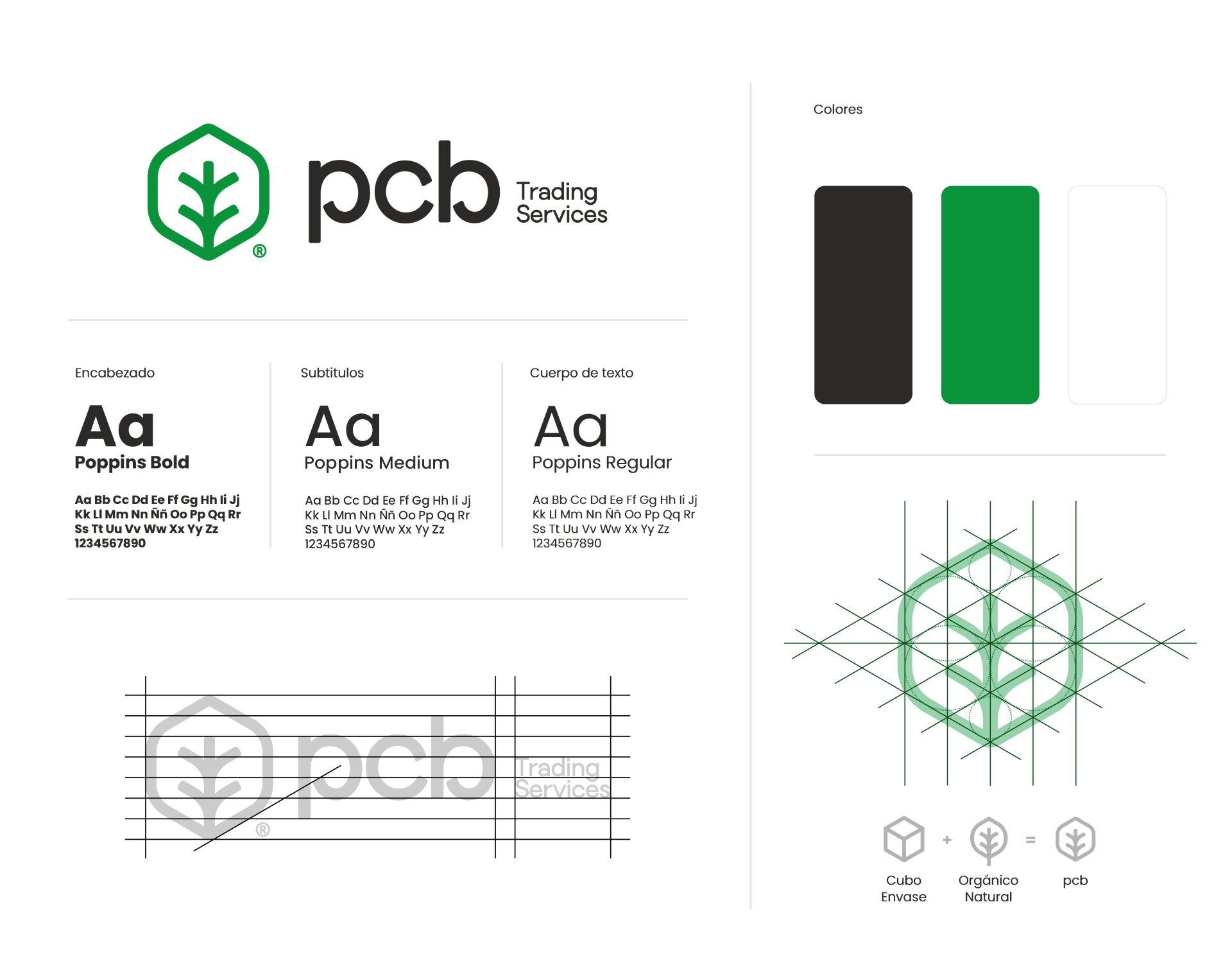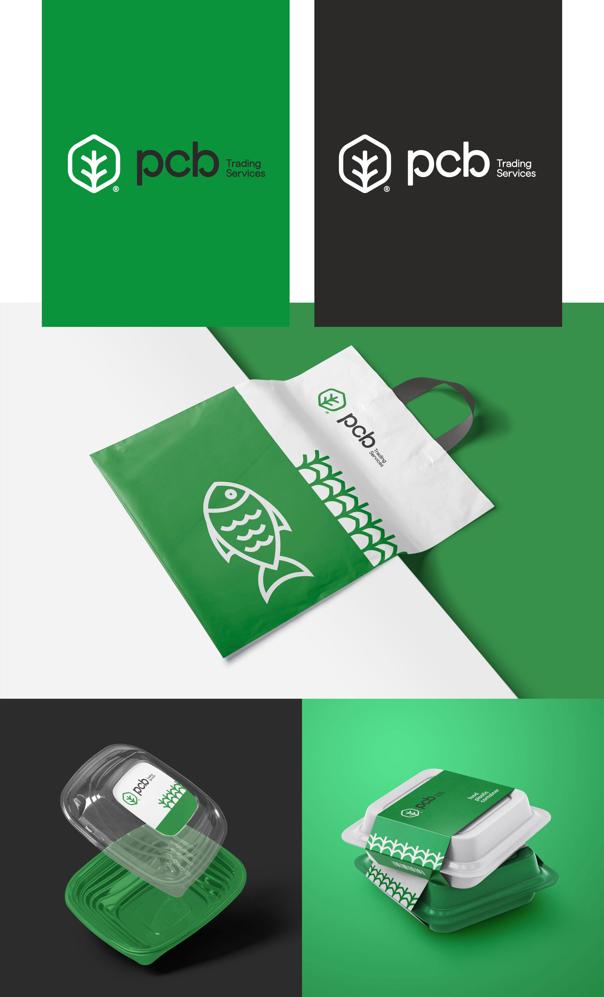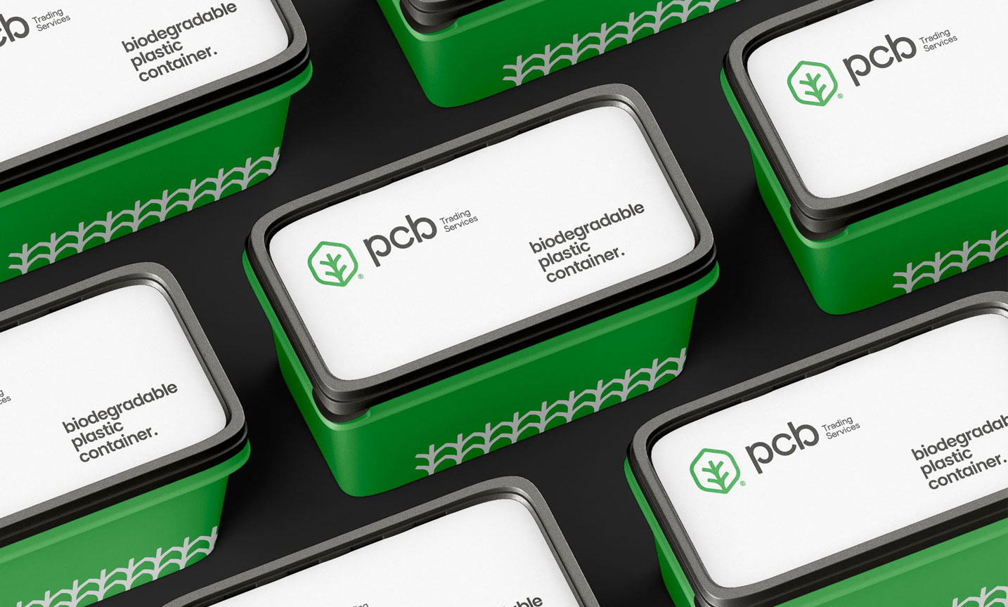 Branding for PCB Trading Services, a sustainable packaging company, focused on conveying innovation and environmental commitment. The modern and minimalist logo is accompanied by a green and navy blue palette that reflects freshness, confidence, and ecological responsibility. The clean and consistent design of the biodegradable packaging reinforces the identity of a brand committed to practical and environmentally friendly solutions.